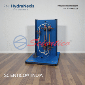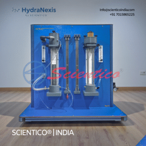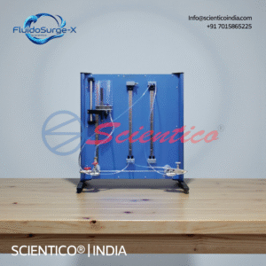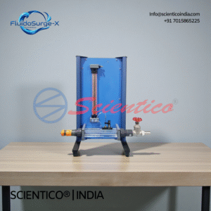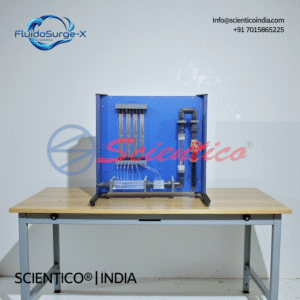 The Orifice Flowmeter | FluidoSurge-X 232 by SCIENTICO is a laboratory apparatus for studying flow measurement using the differential pressure method. It features a transparent acrylic pipe section with an orifice plate and manometer connections for pressure loss measurement. The unit supports experiments on Bernoulli’s principle and continuity law. Suitable for fluid mechanics and hydraulics teaching laboratories.