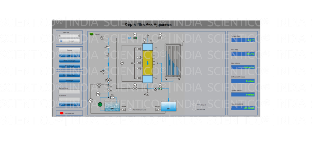 The Depth Filtration Unit (HydraNexis HNX 09) by SCIENTICO is a laboratory-scale pilot plant designed to demonstrate the fundamental principles of depth filtration and backwashing in water treatment. The unit provides a clear, measurable, and visual understanding of particle removal, pressure loss development, and filter bed behavior under varying operating conditions.