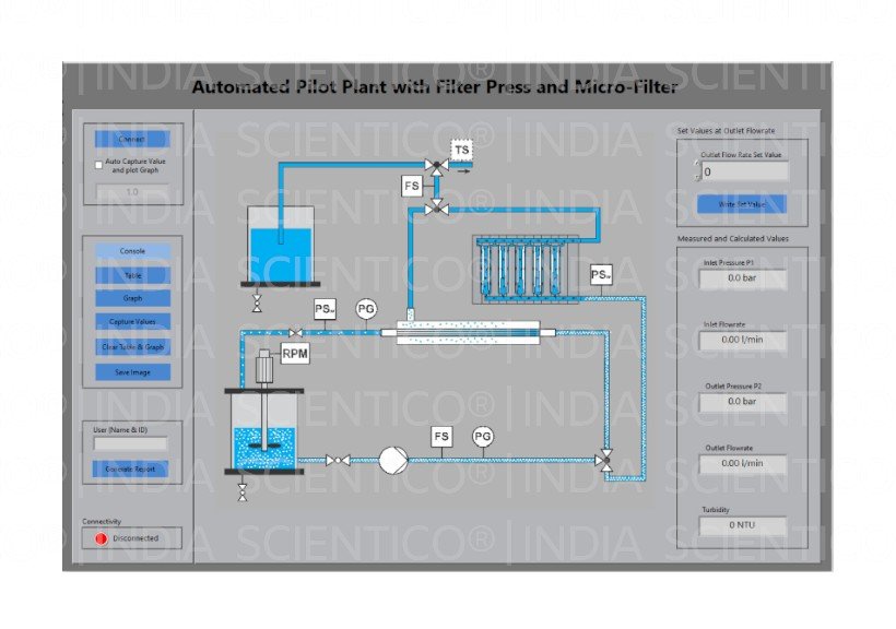 The Filter Press and Micro Filter Pilot Plant (HydraNexis HNX 03) by SCIENTICO is a laboratory-scale filtration system demonstrating cake filtration and tangential microfiltration. It enables detailed study of solid-liquid separation, filter cake formation, and filtration dynamics. Designed for engineering education and research, the system supports controlled experiments with real-time monitoring. Built for reliable laboratory operation, it is suitable for domestic and international supply.
