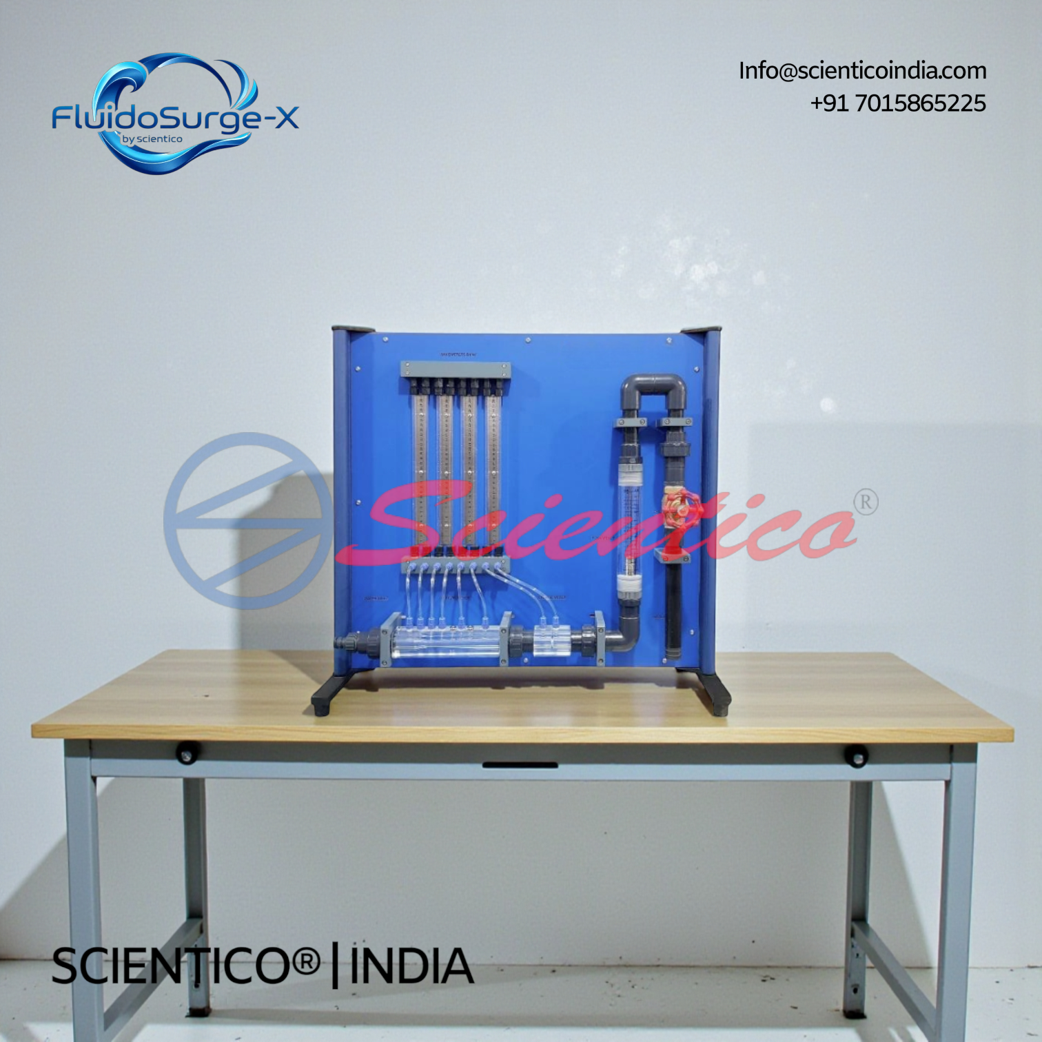SCIENTICO manufactures the Flowmeter Measurement Apparatus FluidoSurge-X 136 for domestic and international supply. The unit is suitable for export to engineering colleges, universities, and technical training laboratories. Standard packing, accessories, and documentation are provided with each supply.