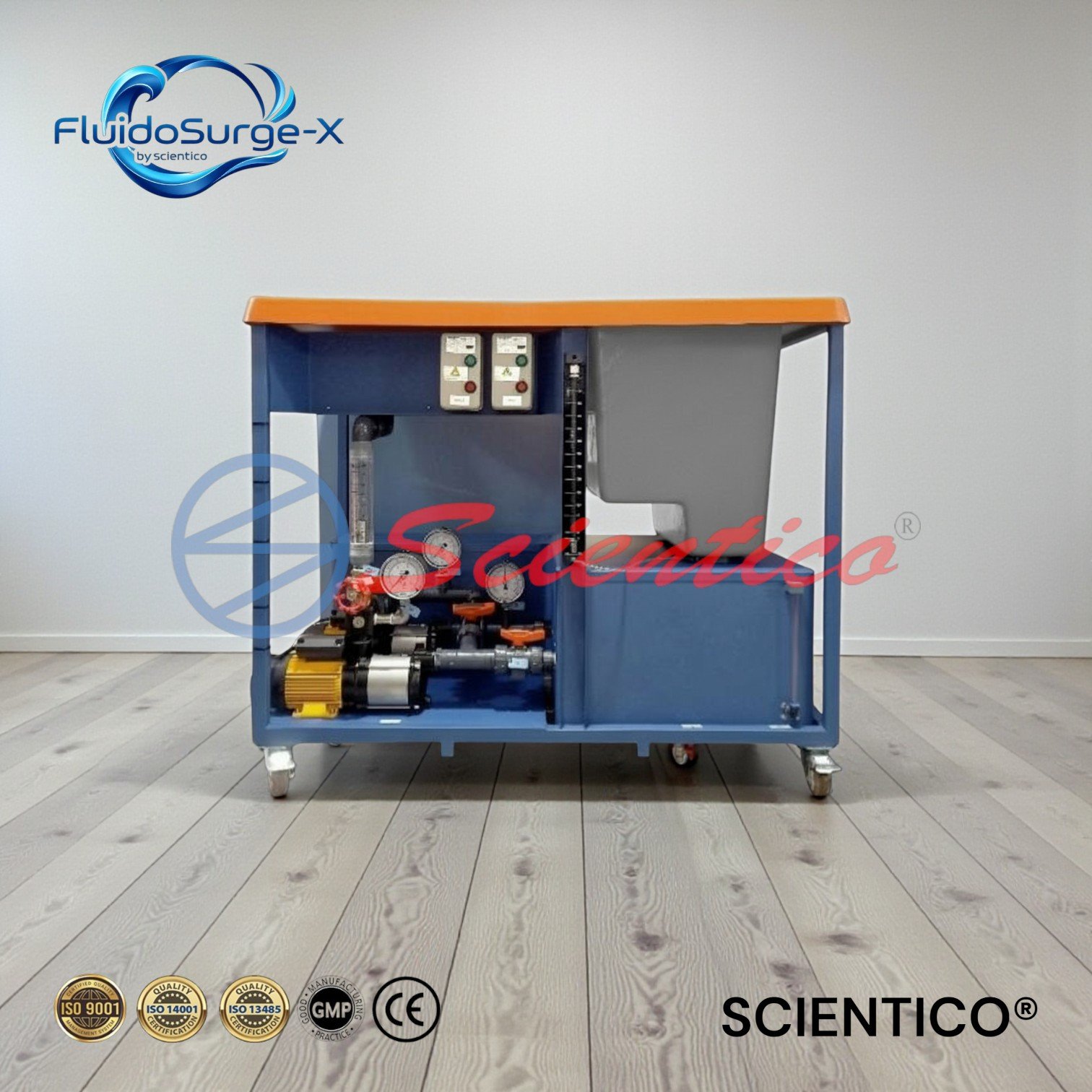 The SCIENTICO FluidoSurgeX 104 Hydraulic Bench is designed for studying centrifugal pump performance in fluid mechanics laboratories.