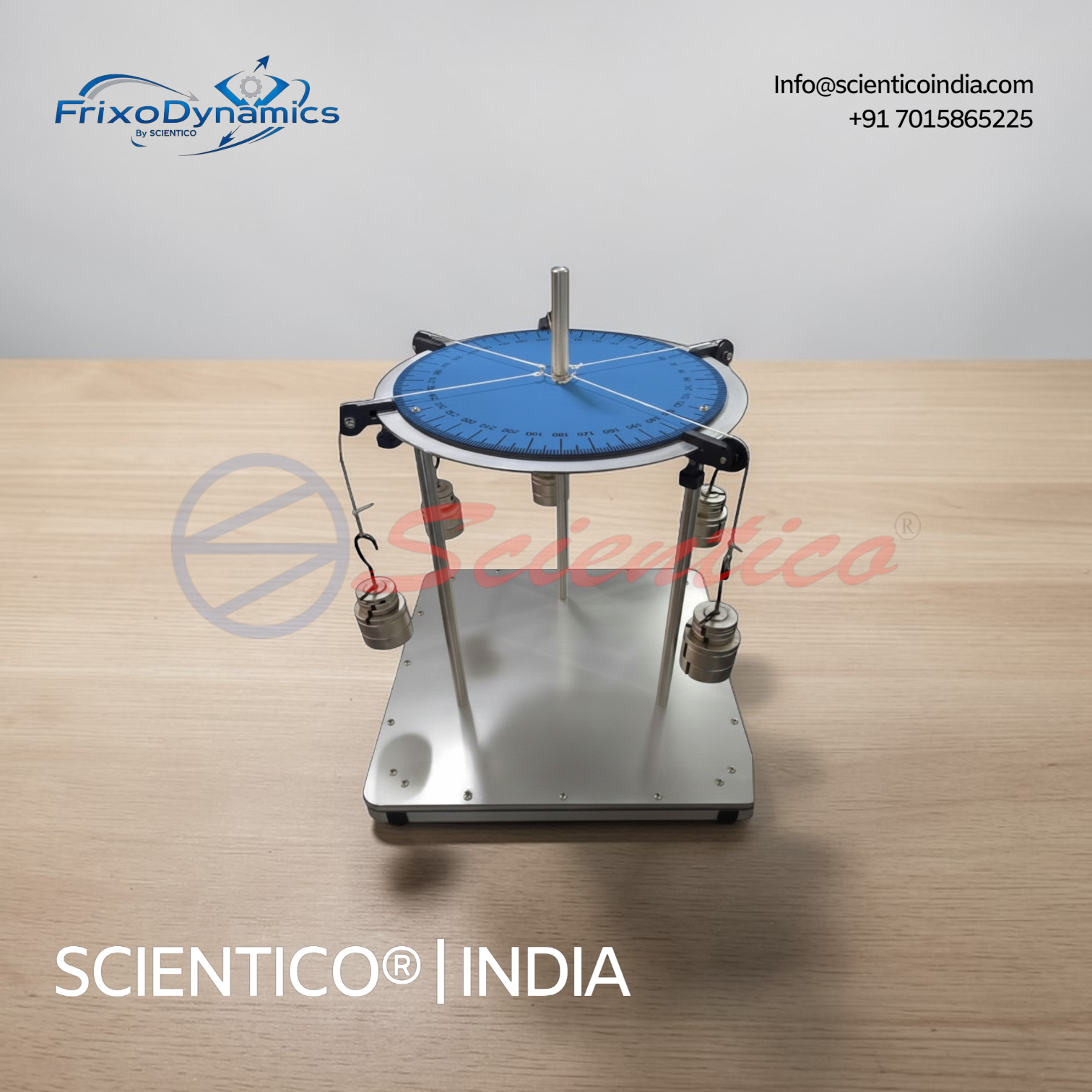 The SCIENTICO FrixoDynamics FX-516 Polygon of Forces Apparatus is a self-contained bench-mounted statics unit for the experimental investigation and graphical verification of coplanar force equilibrium. Up to five calibrated loads are applied via pulleys clamped at adjustable angular positions around a circular disc fitted with a 360° protractor. Equilibrium is confirmed when a central ring centres over the disc’s central pin, and force lines are traced onto paper for construction of the triangle of forces, polygon of forces, or link polygon. Both concurrent and non-concurrent coplanar force systems can be investigated, including forces applied to a circular disc or rectangular lamina. A calibrated weight set with increments down to 0.1 N provides precise load variation. Suitable for undergraduate statics and applied mechanics laboratories, the FX-516 is supplied complete with five pulleys, five weight sets, ring, thread, and instructional manual. Manufactured by SCIENTICO, available for institutional supply and international distribution.