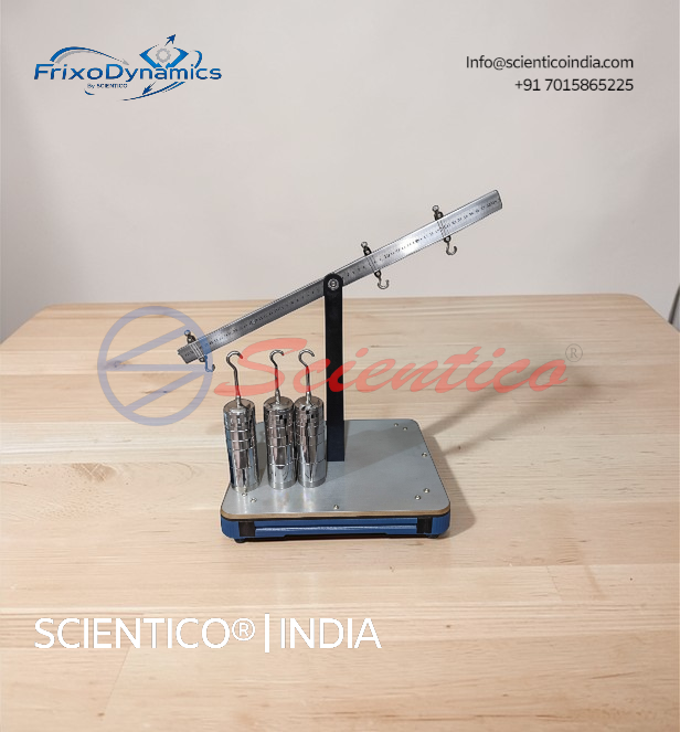 The SCIENTICO FrixoDynamics FX-515 Two Arm Lever Apparatus is a bench-top statics unit for the experimental study of moment equilibrium on a centrally pivoted beam. The 600 mm beam — mounted on precision ball bearings at its midpoint and graduated along its full length — provides two 300 mm lever arms on which three riders with hooks can be positioned at any scale point. Known weights are applied to each rider, and students adjust load positions and magnitudes to achieve rotational equilibrium, directly verifying the law of moments. The ball bearing pivot ensures high sensitivity to moment imbalance, making the unit suitable for precise quantitative experiments as well as introductory demonstrations. A comprehensive weight set covering 0.5 N to 5 N denominations supports a wide range of loading combinations. Manufactured by SCIENTICO, available for institutional supply and international distribution.