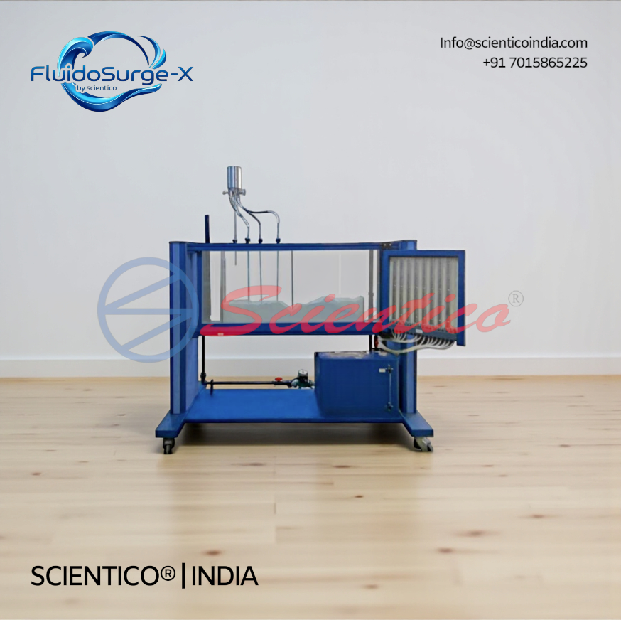 The Visualization of Seepage Flows | FluidoSurge-X 328 by SCIENTICO is a laboratory apparatus for studying seepage and groundwater flow through permeable media. It enables visualization of streamlines and flow nets using a contrast medium and supports pressure distribution studies on hydraulic structures. The closed water circuit and transparent construction allow clear and repeatable experiments. Suitable for civil engineering and fluid mechanics teaching laboratories.